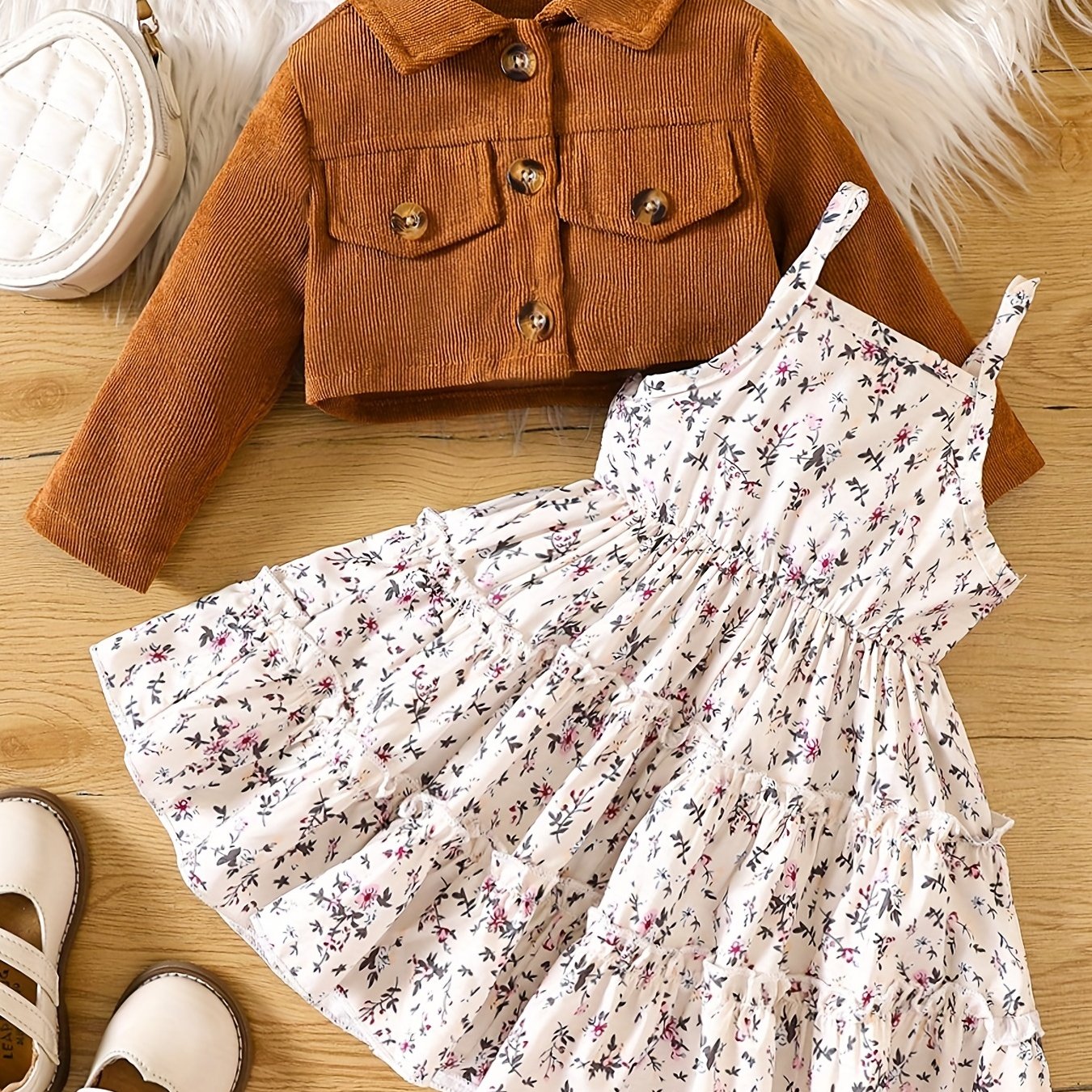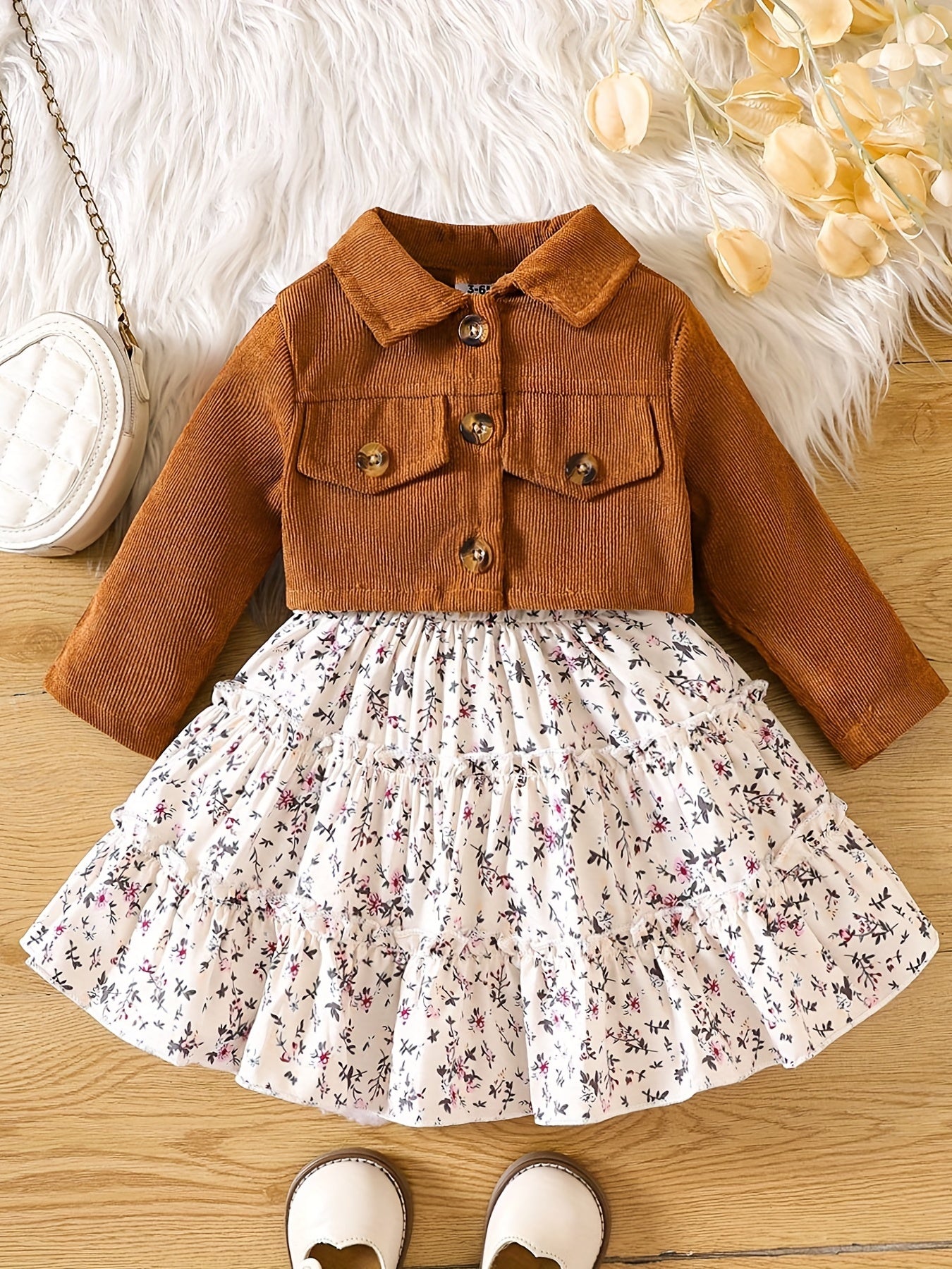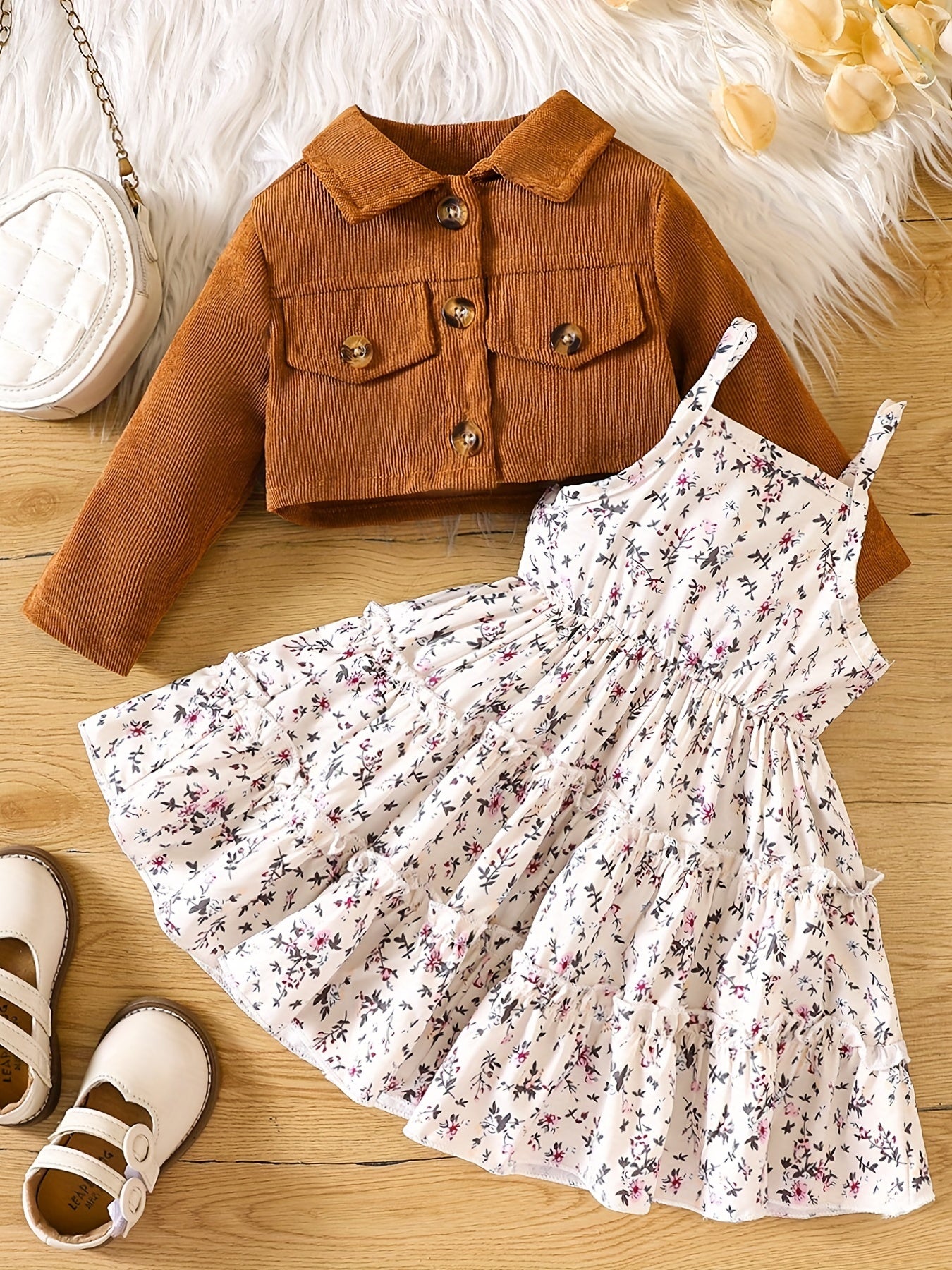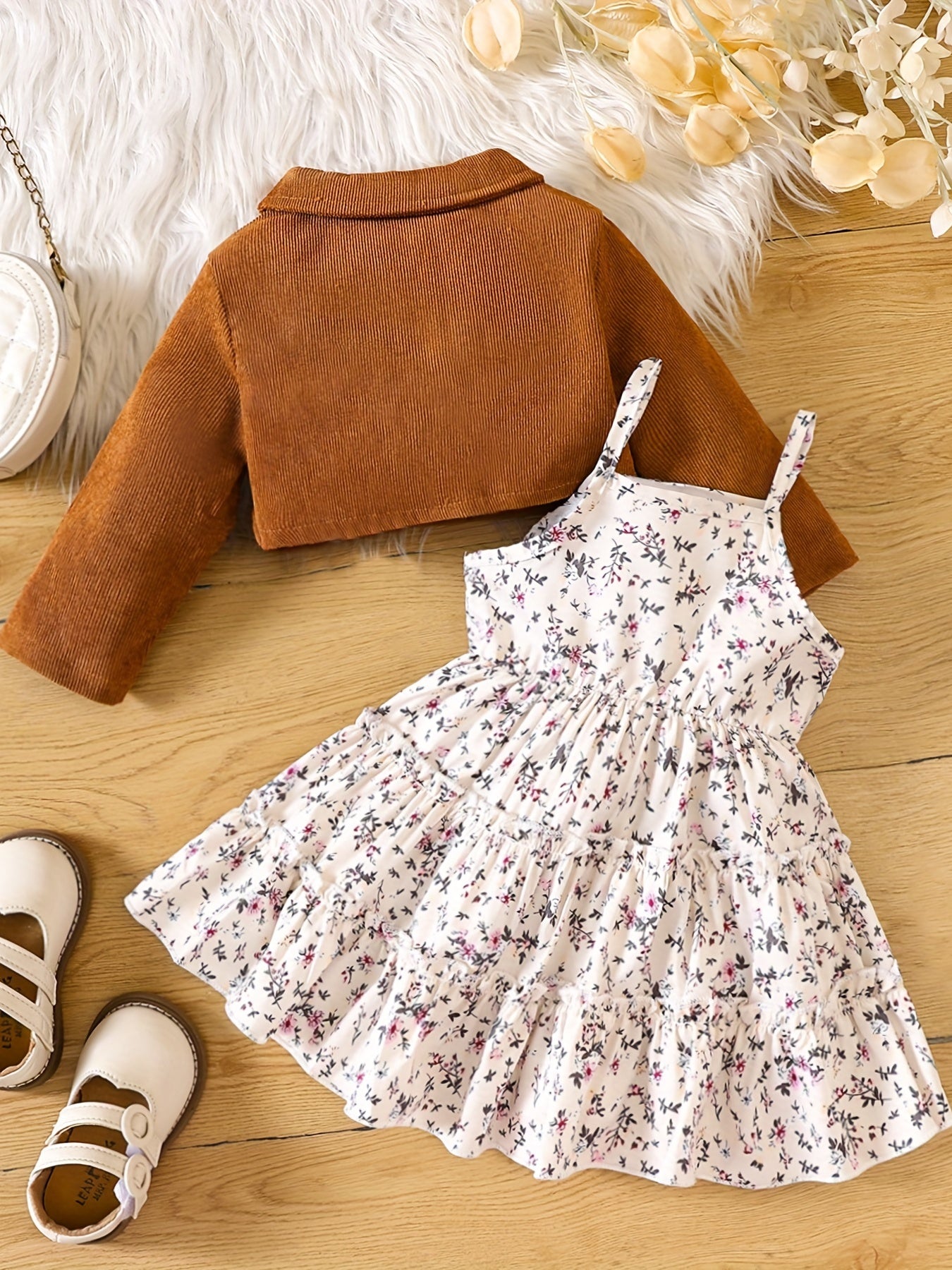 Baby Girl Floral Dress with Turnover Collar and Long Sleeve Jacket 2 Piece Set