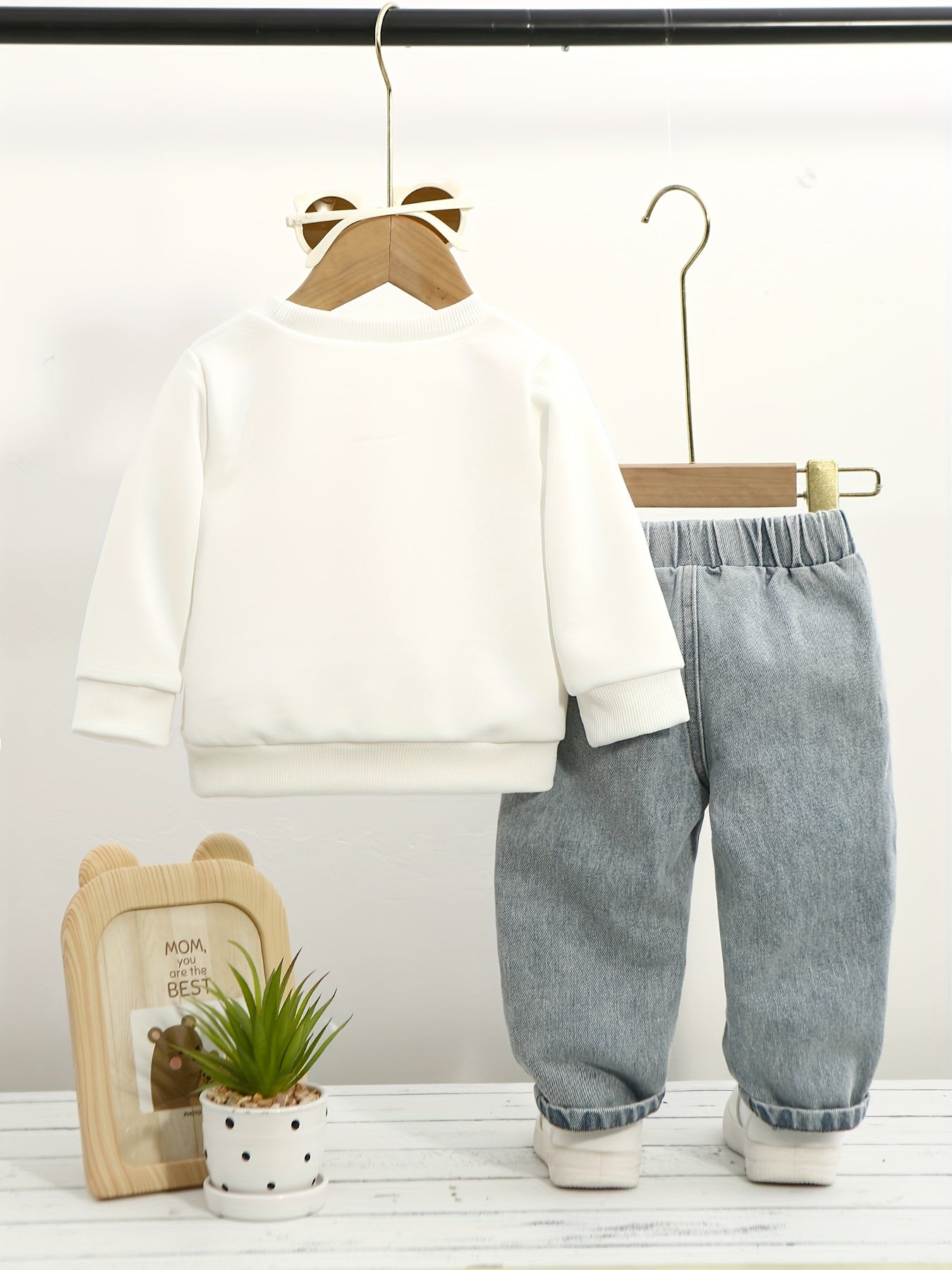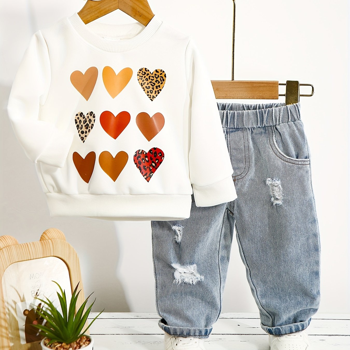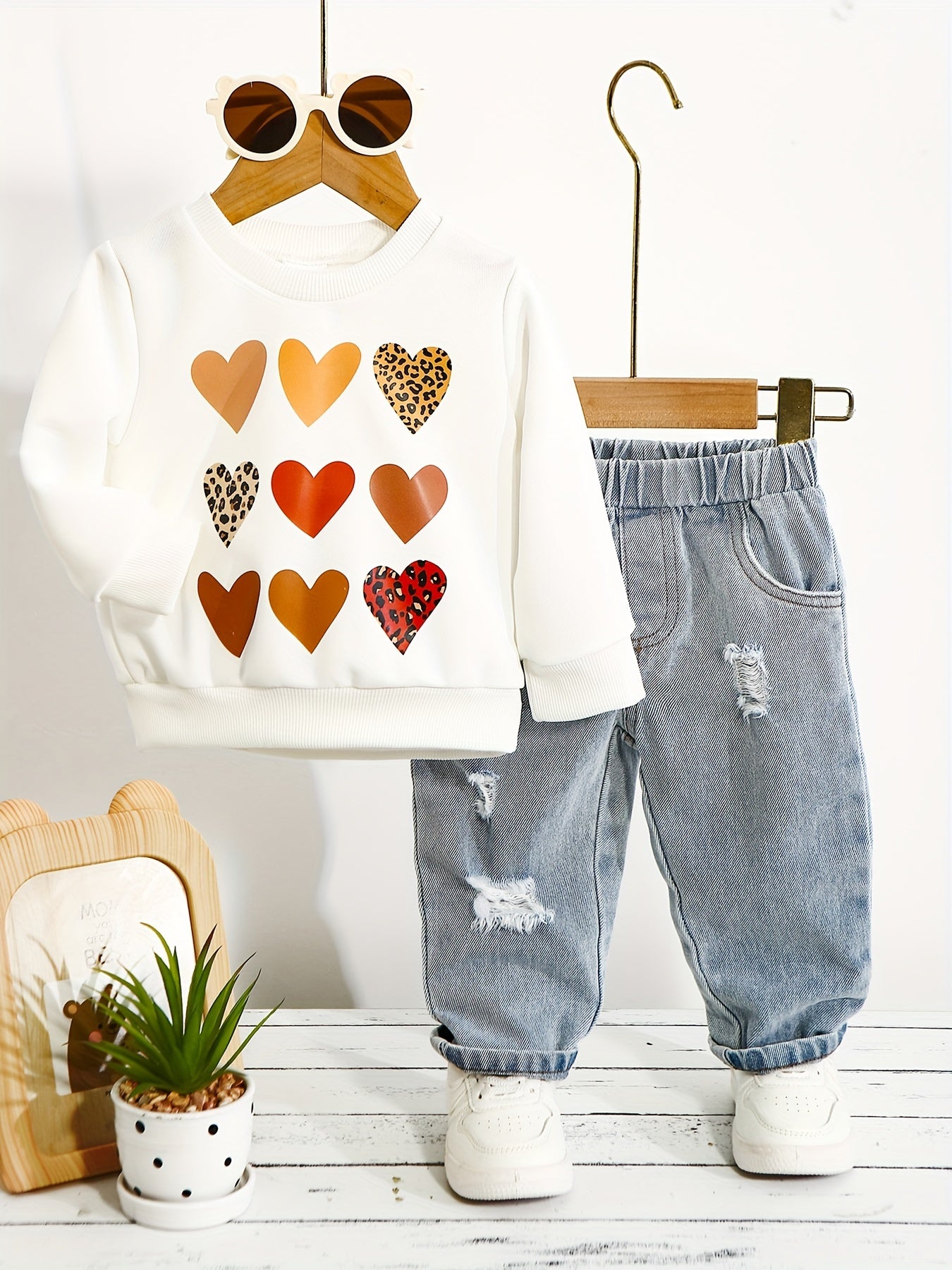 Girl Denim Pants + Cool Love Print Sweatshirt 2pcs Set